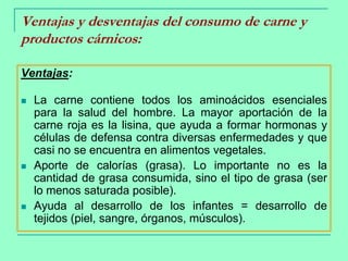 Este documento discute las ventajas y desventajas del consumo de carne y productos cárnicos. Entre las ventajas se encuentran que la carne proporciona proteínas completas, minerales, vitaminas y calorías. Sin embargo, también se asocia el consumo excesivo de carne roja con algunos tipos de cáncer. Además, analiza enfermedades como la encefalopatía espongiforme bovina y la gripe aviar y porcina. Finalmente, explica las propiedades nutricionales y funcional