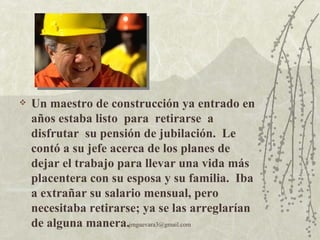 Un maestro de construcción estaba listo para retirarse pero su jefe le pidió que construyera una casa más como último trabajo, la cual construyó con malos materiales y trabajo deficiente. Cuando terminó, el jefe le dio las llaves de la casa como regalo, por lo que el maestro ahora tendría que vivir en la casa imperfecta que construyó. El documento concluye que debemos construir nuestras vidas de la misma manera en que construimos una casa, con sabiduría y buenas decisiones cada día.
