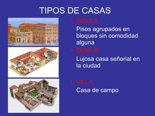 El documento describe los tipos de viviendas en la casa romana, incluyendo la insula, domus y villa. Se enfoca en la domus, la cual era una casa señorial urbana orientada hacia el interior con habitaciones distribuidas alrededor de dos áreas centrales. Describe las partes clave de la domus como el vestíbulo, el atrio central, el triclinium para comer, el cubiculum para dormir y el peristilo jardín interior. También cubre aspectos como la cocina, el baño, la calefacción e iluminación.