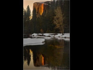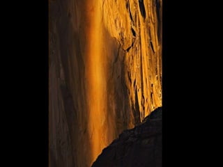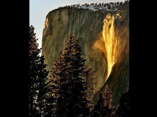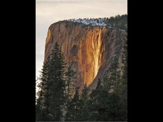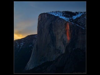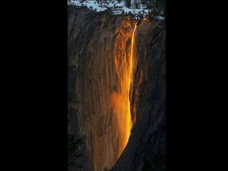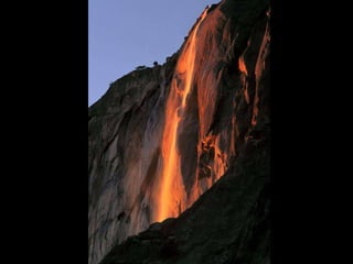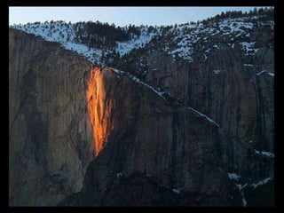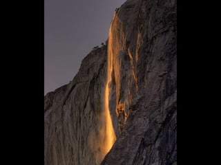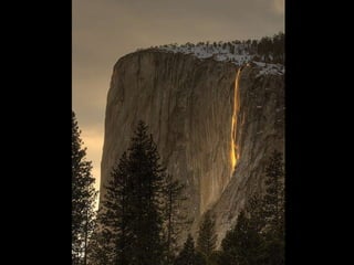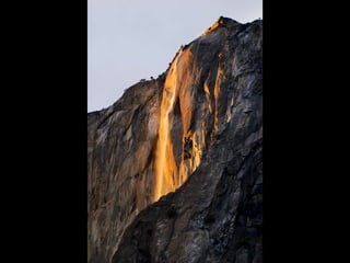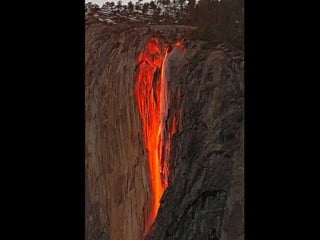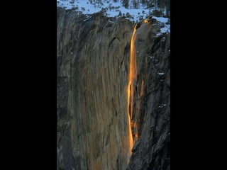 La cascada parece lava cayendo desde lo alto, pero es una ilusión óptica causada por la luz del sol iluminando el agua desde atrás. Este fenómeno ocurre durante unos pocos minutos a mediados de febrero en la cascada estacional Horsetail Fall en el Parque Nacional Yosemite, California, creando la apariencia de una "cascada de fuego". Ver este espectáculo requiere paciencia debido a su corta duración y a las condiciones climáticas impredecibles.