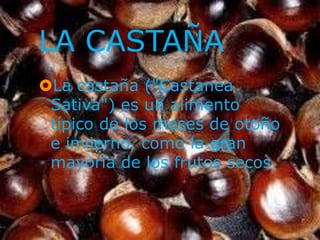 La castaña es un alimento típico de otoño e invierno como muchos frutos secos, es un fruto seco comestible producido por el castaño y se consume principalmente durante los meses de otoño e invierno.