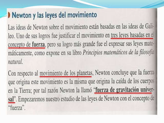 Este documento resume los principales conceptos relacionados con las fuerzas. Define la unidad de medida de las fuerzas como el Newton. Explica los diferentes tipos de fuerzas como el peso, la fuerza normal, la tensión y la fuerza elástica. Describe las leyes de Newton sobre el movimiento de los cuerpos y las fuerzas que actúan sobre ellos.