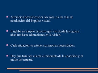 Este documento trata sobre la ceguera y las ayudas disponibles para personas con deficiencia visual. Describe los diferentes grados de ceguera, el sistema Braille para la lectoescritura táctil, y las herramientas técnicas como lectores de pantalla, dispositivos hablantes y software de ampliación que facilitan la comunicación y autonomía de las personas ciegas.