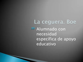 El documento habla sobre la escolarización del alumnado con necesidades educativas especiales. Establece que deben seguir los principios de normalización, inclusión y no discriminación, con escolarización en centros ordinarios siempre que sea posible. También cubre la identificación temprana de necesidades, evaluación continua, promoción de la educación infantil, oportunidades formativas para quienes no alcancen los objetivos de la educación obligatoria, y los recursos que deben proporcionar las administraciones públicas para apoyar adecu