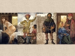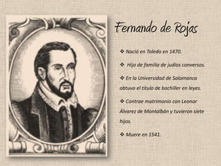 La Celestina es una obra escrita por Fernando de Rojas a finales del siglo XV. Narra la historia de amor entre Calisto y Melibea y cómo la alcahueta Celestina los ayuda a encontrarse a pesar de sus diferentes clases sociales, lo que lleva a varias muertes. La obra critica los peligros del amor y la codicia y muestra el pesimismo de la época sobre el destino de la muerte que enfrentan los que desafían las normas sociales.