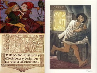 Calisto se enamora de Melibea y contrata a Celestina para que los una. Celestina se niega a compartir sus ganancias con los criados de Calisto, quienes la matan. Más tarde, Calisto muere tratando de ver a Melibea y ella se suicida de la pena. Areúsa y Elicia son prostitutas que odian a los hombres y a Melibea. Areúsa recibe clientes en su casa mientras Elicia tiene una clientela fija.