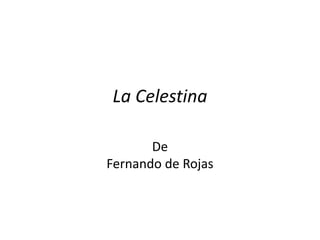 Este documento resume la autoría, estructura y personajes de la obra La Celestina de Fernando de Rojas. En cuanto a la autoría, se discuten las teorías sobre si fue escrita por un solo autor o varios, y se presenta una biografía de Fernando de Rojas. En relación a la estructura, divide la obra en dos partes con varios actos cada una. Finalmente, describe los principales personajes divididos en dos grupos según su clase social: los amantes Calisto y Melibea, y los criados y otras figuras.