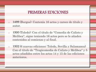 La Celestina es una obra de Fernando de Rojas del siglo XV. Narra la historia de amor entre Calisto y Melibea y la intervención de la alcahueta Celestina para unirlos. La obra pasó por varias ediciones tempranas con distintas estructuras. Actualmente se cree que fue escrita por dos autores, siendo Fernando de Rojas el autor del trabajo completo. Presenta características de género dramático y narrativo. Algunos de los capítulos clave describen el enamoramiento de Calisto, las maquinaciones de