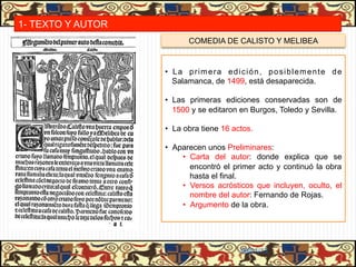 Calisto es el protagonista masculino de la obra. Es un joven noble rico y ocioso que se enamora apasionadamente de Melibea tras un encuentro fortuito. Para conquistar a Melibea, que inicialmente lo rechaza, no duda en recurrir a todas las artimañas posibles, incluyendo a la vieja Celestina. Representa la parodia del amor cortés y su locura amorosa lo vuelve insensato y egoísta.