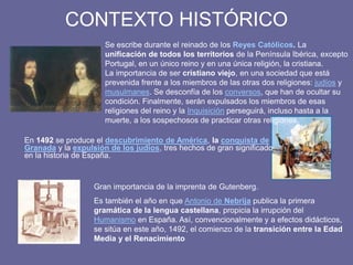 Este documento resume el contexto histórico y los detalles más importantes sobre La Celestina, una de las obras más influyentes de la literatura española escrita por Fernando de Rojas a finales del siglo XV. Se describe la trama de la obra, que trata sobre los trágicos amores entre Calisto y Melibea y las maquinaciones de la alcahueta Celestina para unirlos. También se resumen los principales personajes como Calisto, Melibea, Celestina, Pármeno y Sempronio, y se analiza brevemente el