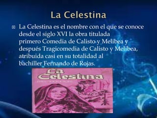 Este documento resume la obra literaria La Celestina de Fernando de Rojas. Explica que la obra se centra en las pasiones de Calisto y Melibea y cómo la alcahueta Celestina los ayuda a estar juntos, hasta que sus celos y avaricia conducen a su muerte. También describe a los personajes principales como Calisto, un joven egoísta; Melibea, una mujer apasionada; y Pármeno, el criado corrompido. Finalmente, resume la estructura, tiempo y espacio de la obra, notando su dinámica urbana