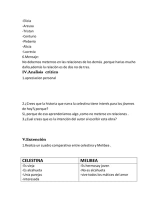 La Celestina es una obra de Fernando de Rojas del siglo XV. Narra la historia de amor entre Calisto y Melibea, y cómo la alcahueta Celestina los ayuda a estar juntos causando varios problemas y muertes antes de que ambos protagonistas también mueran al final. La obra critica las relaciones amorosas en las que se meten terceros y cómo esto solo trae consecuencias negativas.