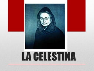 La obra La Celestina cuenta la historia de amor entre Calisto y Melibea, quienes se enamoran con la ayuda de la alcahueta Celestina. Calisto muere al caer de un muro durante una visita nocturna a Melibea, y ella se suicida de dolor. La obra presenta temas como el amor ilícito, la codicia, y la venganza, y busca advertir a los lectores sobre los peligros de los malos consejeros y los amores prohibidos.