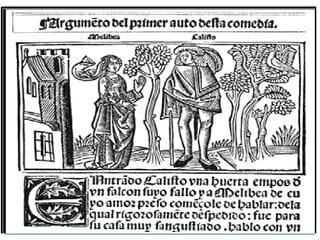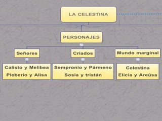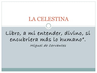 La Celestina es una obra anónima publicada en 1499 que consta de 21 actos. Narra la historia de amor entre Calisto y Melibea y cómo la alcahueta Celestina los ayuda a encontrarse a cambio de dinero, lo que tiene consecuencias trágicas. Aunque se concibió como obra teatral, se considera una novela dialogada. Refleja el paso de la Edad Media al Renacimiento a través de personajes que transgreden las normas sociales y morales de la época. Su estilo combina lo culto y lo popular, y aunque