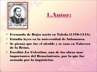 El documento resume la vida y obra de Fernando de Rojas, autor de La Celestina. Explica que Rojas nació en 1470 en Toledo y estudió leyes en Salamanca, y que escribió La Celestina, una de las obras más importantes del Renacimiento. La obra, escrita en forma de diálogo, narra la historia de amor entre Calisto y Melibea y refleja la sociedad medieval y el surgimiento de la burguesía.