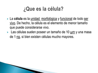 La célula es la unidad morfológica y funcional esencial de todos los seres vivos, siendo el elemento más pequeño que puede considerarse vivo. Existen dos tipos de organización celular: procariotas, que son simples y primitivas, y eucariotas, que son más grandes y complejas. Los organismos se clasifican en unicelulares, formados por una sola célula, y pluricelulares, compuestos por múltiples células.