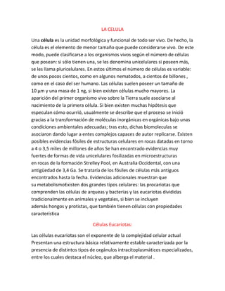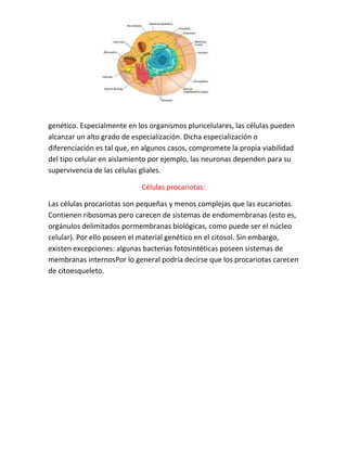 Las células son la unidad básica de todo ser vivo. Existen dos tipos principales de células: las procariotas, como las bacterias, que son más pequeñas y menos complejas que las eucariotas encontradas en animales, plantas, hongos y protistas. Las células eucariotas contienen orgánulos especializados como el núcleo y pueden diferenciarse, mientras que las procariotas carecen de membranas y su material genético se encuentra en el citosol. El estudio de las células a pequeña escala ha sido