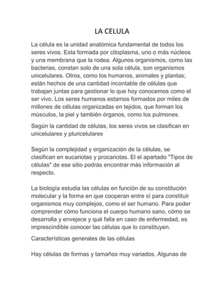 Las células son la unidad fundamental de todos los seres vivos. Pueden ser unicelulares, como las bacterias, u organismos pluricelulares como los humanos, animales y plantas. Existen dos tipos principales de células: procariotas y eucariotas. La biología estudia las células para comprender cómo funcionan los organismos complejos y qué falla en las enfermedades.