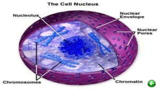 Este documento resume las partes principales de la célula, incluyendo la membrana celular, el retículo endoplásmico, los ribosomas, el aparato de Golgi, los lisosomas, las mitocondrias y el núcleo. Cada parte se define brevemente, con la membrana celular que actúa como un filtro selectivo, el retículo endoplásmico involucrado en la síntesis de proteínas, y el núcleo que contiene el material genético de la célula.