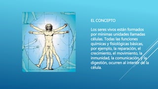 Este documento describe la célula, su estructura y funciones. La célula es la unidad básica de los seres vivos y está formada por la membrana celular, el citoplasma y el núcleo. El citoplasma contiene organoides que realizan funciones esenciales como la producción de energía y procesamiento de proteínas, mientras que el núcleo alberga el ADN y controla las actividades de la célula.