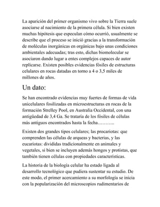 La célula es la unidad básica de todo ser vivo. Las células pueden ser unicelulares u pluricelulares. La teoría celular postula que todos los organismos están compuestos por células, y que todas las células derivan de otras precedentes. Se cree que la primera célula apareció hace entre 4,000 y 3,500 millones de años a partir de moléculas orgánicas en condiciones ambientales adecuadas.