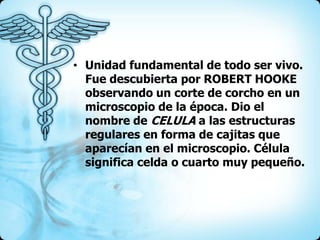 La célula es la unidad fundamental de todo ser vivo. Fue descubierta por Robert Hooke en el siglo XVII al observar células en un corte de corcho bajo el microscopio. Existen dos tipos de células: procariotas y eucariotas. La célula contiene diversas estructuras llamadas organelos como la membrana, el núcleo, el citoplasma, la mitocondria y el retículo endoplasmático, cada uno con funciones específicas importantes para el funcionamiento de la célula.
