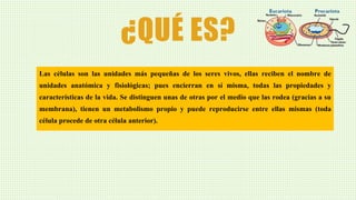 Este documento describe la célula, la unidad básica de los seres vivos. Explica que existen dos tipos principales de células, las eucariotas y las procariotas, y describe sus características y componentes clave. También resume los diferentes tipos de división celular, incluida la mitosis, la meiosis y las diferencias entre ellas. El documento proporciona una visión general completa de la estructura, función y reproducción de las células.