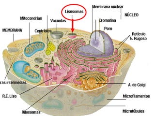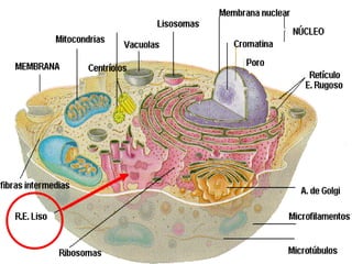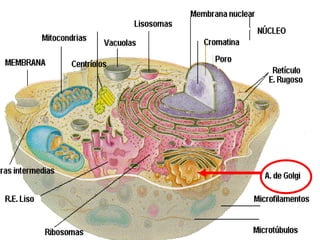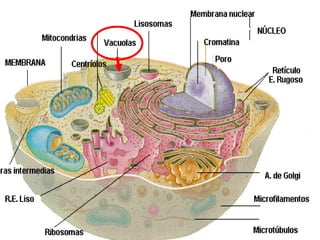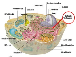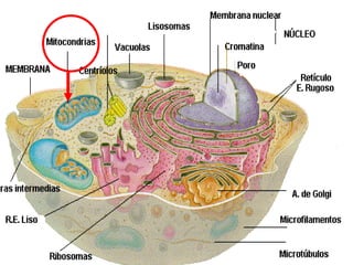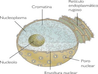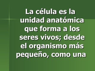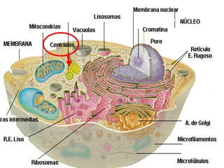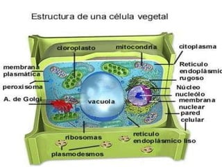 El documento proporciona una descripción general de las células. Explica que la célula es la unidad básica de todos los seres vivos, desde bacterias hasta ballenas. Describe las diferencias entre células procariotas y eucariotas, y enumera las partes principales de la célula, incluida la membrana, el citoplasma y el núcleo. Resalta que el núcleo controla y dirige toda la actividad celular y contiene la información genética.
