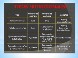 Este documento trata sobre microbiología. Habla sobre la respiración aerobia y anaerobia en bacterias, así como sobre enzimas como NAD, FAD y coenzima Q involucradas en estos procesos. También cubre la reproducción celular en bacterias a través de división simple y la estructura de su genoma, incluyendo plasmides. Finalmente, describe mecanismos de transferencia genética como transformación, conjugación y transducción, así como el ciclo de vida de virus que infectan bacterias.