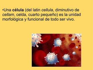 La célula es la unidad básica de todo ser vivo y contiene una membrana, citoplasma y material genético (ADN). Existen dos tipos de células, las eucariotas que tienen el ADN dentro del núcleo y las procariotas que no lo tienen. El citoplasma contiene diversos orgánulos como el retículo endoplasmático, ribosomas, mitocondrias, lisosomas y aparato de Golgi. El núcleo alberga el ADN en forma de cromosomas y determina el sexo de cada individuo