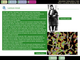 El documento proporciona información sobre las células HeLa y su descubrimiento. En 1951, las células de Henrietta Lacks, una mujer estadounidense que murió de cáncer de cuello uterino, fueron las primeras células humanas que pudieron cultivarse de forma continua en el laboratorio. Estas células, llamadas HeLa, han permitido miles de investigaciones sobre el cáncer y otros avances científicos. Desde entonces, las células HeLa no han dejado de dividirse y utilizarse en laborator