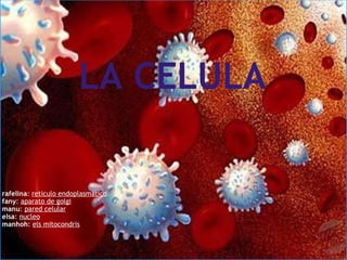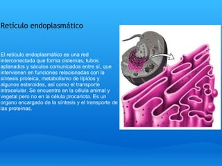 El documento describe diferentes organelos celulares: el retículo endoplasmático, encargado de la síntesis y transporte de proteínas; la pared celular, que protege el contenido celular y da rigidez; el núcleo, que contiene el material genético; y los mitocondrias, que generan energía para la célula en forma de ATP. También describe el aparato de Golgi, que modifica vesículas y completa la fabricación de proteínas.