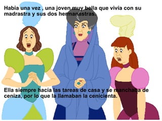 La Cenicienta es una joven bella que vive con su madrastra y hermanastras, quienes la obligan a hacer las tareas de la casa. Su hada madrina la ayuda a ir a un baile en el palacio real donde el príncipe se enamora de ella, aunque debe irse a medianoche. El príncipe busca a la joven dueña del zapato de cristal que dejó atrás Cenicienta, y al final la encuentra. El príncipe se casa con Cenicienta y viven felices para siempre.