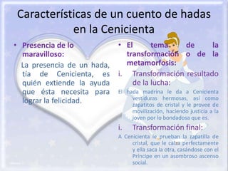 Este documento resume las características clave de un cuento de hadas encontradas en La Cenicienta de Charles Perrault. Entre ellas se encuentran la presencia de lo maravilloso a través del hada madrina, el tema de la transformación de Cenicienta gracias a la ayuda del hada, los obstáculos que debe enfrentar Cenicienta, y el final feliz donde se casa con el Príncipe.