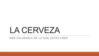 El documento describe los múltiples beneficios para la salud del consumo moderado de cerveza. La cerveza tiene bajas calorías, alto contenido en fibra, propiedades que ayudan a la digestión y la salud gástrica, es baja en sodio y tiene un alto poder diurético. Además, los componentes del lúpulo tienen propiedades antiinflamatorias y antibacterianas, y el xanthohumol puede ayudar a prevenir cáncer. El consumo moderado de cerveza también puede apoyar el sistema