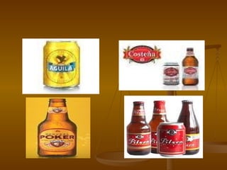 La cerveza es una bebida alcohólica no destilada hecha a partir de granos como cebada y otros cereales que son fermentados en agua y aromatizados con lúpulo. La cerveza tiene una historia que se remonta a 3500 a.C. en el antiguo Elam, y se usa en la alimentación para reponer energías y ayudar a prevenir enfermedades como el Alzheimer cuando se consume moderadamente. Algunas de las marcas de cerveza colombianas más populares son Aguila, Aguila Light