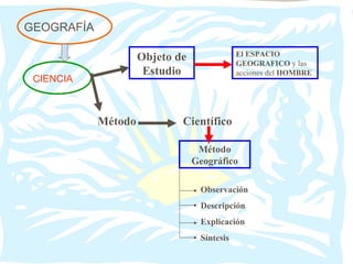 La presentación introduce la geografía como una ciencia social que estudia el espacio geográfico y cómo el hombre lo modifica. Explica que el espacio geográfico incluye el medio natural con sus esferas de la atmósfera, hidrosfera, litosfera y biosfera. Luego describe los diferentes tipos de mapas para representar el espacio geográfico y los ambientes y paisajes. Finalmente, menciona algunos problemas ambientales actuales y la importancia del desarrollo sustentable.