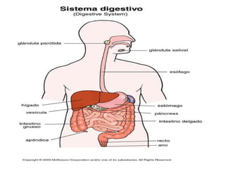 Este documento trata sobre la circulación sanguínea y los sistemas digestivo y circulatorio. Explica las partes principales de cada sistema como el corazón, vasos sanguíneos, órganos digestivos y glándulas. También describe las funciones de la circulación pulmonar y general, así como los procesos de digestión y absorción de nutrientes.