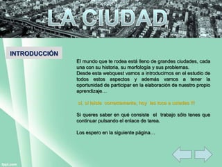 Este documento presenta una webquest sobre los problemas de las ciudades. Los estudiantes deben adoptar roles como ciudadano, clase baja o inmigrante e informar a expertos urbanos sobre las necesidades de las ciudades desde esas perspectivas. El proceso implica investigar sobre conceptos urbanos, elaborar una presentación y carta con sus ideas. La evaluación considera la calidad de la información y presentación, y el trabajo colaborativo. El objetivo es que las autoridades implementen soluciones a los problemas identificados.
