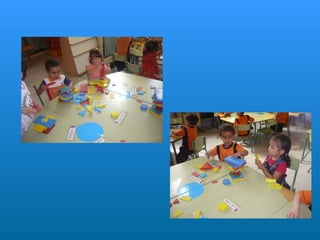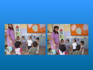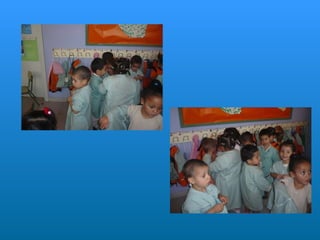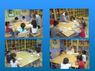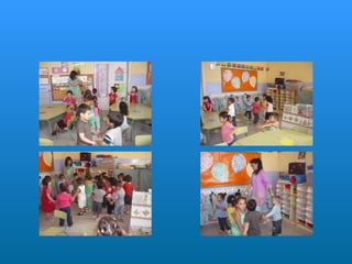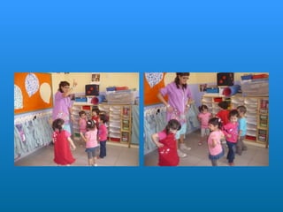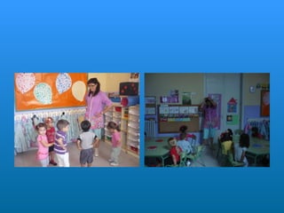 Este documento describe la rutina diaria de una clase de educación infantil. Comienzan el día cantando una canción de bienvenida y pasando lista. Después realizan diferentes actividades como dibujar, jugar, ir a la biblioteca y aprender sobre números y letras. También comen y descansan. A lo largo del día aprenden habilidades sociales como escuchar a los demás y respetar el turno de palabra.