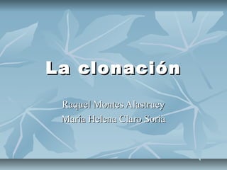 La clonación es el proceso de crear copias genéticamente idénticas de células u organismos. Existen varios tipos de clonación como la clonación celular, clonación humana y clonación terapéutica. Aunque tiene beneficios como mejorar especies y conservarlas, también tiene desventajas éticas como alterar la identidad natural. La Iglesia se opone a la clonación humana pero apoya su uso para fines médicos.