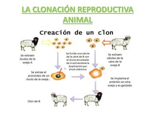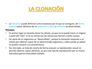 La clonación puede definirse como el proceso de obtener copias idénticas de organismos, células o moléculas de forma asexual. Existen dos tipos principales de clonación: la clonación reproductiva, que crea individuos genéticamente idénticos mediante la transferencia del núcleo de una célula adulta a un óvulo vacío, y la clonación terapéutica, que busca obtener células madre para tratar enfermedades y regenerar tejidos sin causar rechazo, aunque requiere la cre
