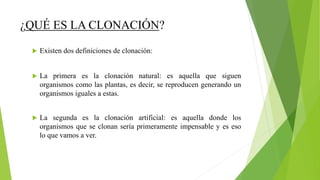 Este documento describe los diferentes tipos de clonación, incluyendo la clonación natural y artificial. Explica que la clonación artificial implica extraer el núcleo de una célula somática y transferirlo a un óvulo vacío para crear un embrión idéntico. También discute los desafíos técnicos y éticos de la clonación, así como sus posibles aplicaciones médicas y agrícolas.