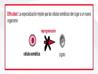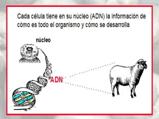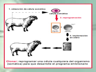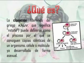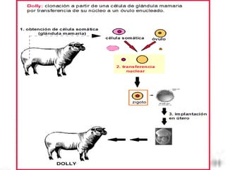 La clonación se define como el proceso de crear copias idénticas de un organismo, célula o molécula de forma asexual. La posibilidad de clonar surgió con el descubrimiento del ADN y cómo se transmite la información genética. Dolly fue el primer animal clonado a partir de una célula somática sin fecundación. Existe debate sobre la clonación humana con fines terapéuticos o reproductivos debido a consideraciones éticas.
