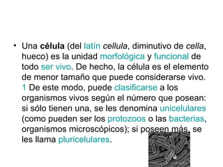 El documento describe las características básicas de las células. Explica que la célula es la unidad funcional y estructural básica de todo ser vivo, ya sea unicelular o pluricelular. Describe que las células poseen una membrana, citoplasma y genoma, y que mantienen la homeostasis a través del metabolismo. Además, distingue entre células procariotas como las bacterias, que carecen de núcleo, y eucariotas, cuyo núcleo está rodeado por una membrana.