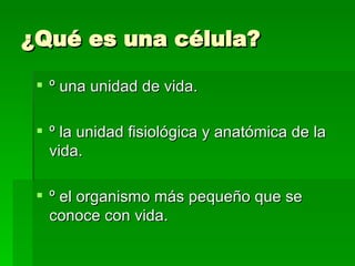 El documento describe las características básicas de las células. Explica que existen células procariotas como las bacterias que no tienen núcleo, y eucariotas como las de animales y plantas que sí lo tienen. Además, señala que la forma de las células depende de su función, como las neuronas con forma estrellada o los glóbulos rojos sin núcleo. Por último, indica que las células se agrupan en tejidos como el epitelio, y los tejidos a su vez se unen para formar