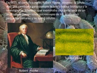 Robert Hooke observó por primera vez las células en 1655 usando un microscopio primitivo. Descubrió pequeñas cámaras en un trozo de corcho y las llamó células. Más tarde, los investigadores determinaron que las células no estaban vacías, sino llenas de citoplasma. Todas las formas de vida están compuestas de células, que son la unidad básica estructural y funcional de los seres vivos.