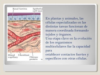 La matriz extracelular está formada por proteínas como el colágeno y la elastina, y glúcidos como los glucosaminoglicanos y proteoglicanos. El colágeno es la proteína más abundante y forma fibras que resisten tensiones. La elastina forma parte de fibras elásticas que permiten la distensión de los tejidos. Los glucosaminoglicanos aportan hidratación y resistencia a presiones. Las proteínas de la matriz se unen entre sí y a las células mediante glicoproteínas como la fibronect