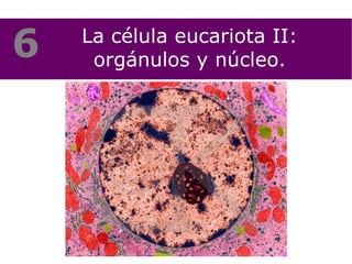 El documento describe los diferentes orgánulos encontrados en las células eucariotas, incluyendo mitocondrias, lisosomas, vacuolas, peroxisomas, plastos, cromoplastos y leucoplastos. Se enfoca específicamente en las mitocondrias, describiendo su función en la producción de energía a través de la conversión de alimentos en ATP, y en los plastos, explicando su papel crucial en la fotosíntesis y la producción de oxígeno y azúcares.
