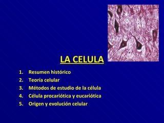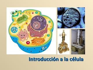 El documento presenta una introducción a la célula, incluyendo una breve historia de la teoría celular desde los primeros avances microscópicos hasta la consolidación de la teoría en el siglo XIX. También describe las diferencias entre células procariotas y eucariotas, y explica la teoría endosimbiótica del origen de los orgánulos como la mitocondria y el cloroplasto.